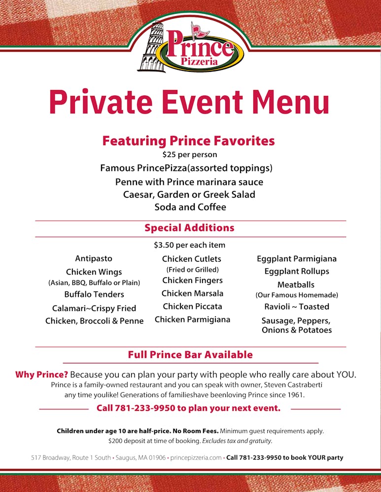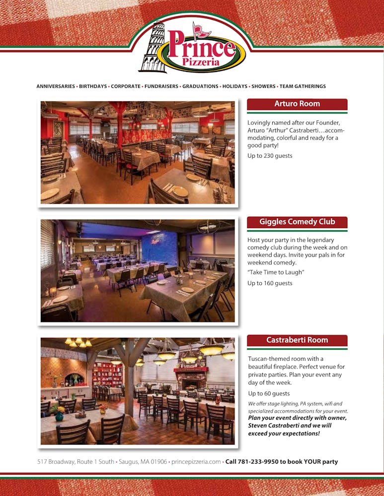 Because you can plan your party with people who really care about YOU. Prince is a family-owned restaurant and you can speak with the owner, Steven Castraberti any time you like! Generations of families have been loving Prince since 1961.