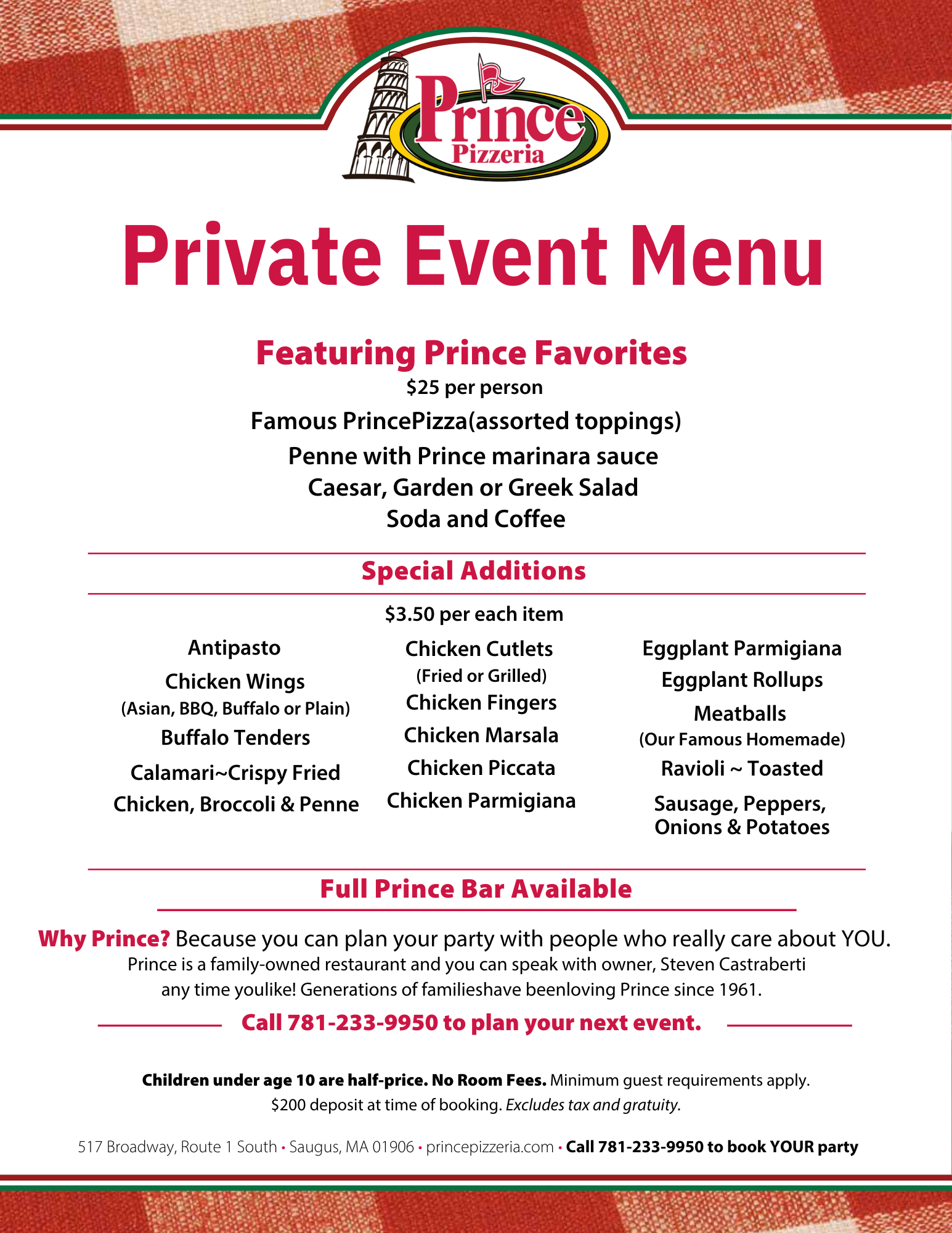 Because you can plan your party with people who really care about YOU. Prince is a family-owned restaurant and you can speak with the owner, Steven Castraberti any time you like! Generations of families have been loving Prince since 1961.