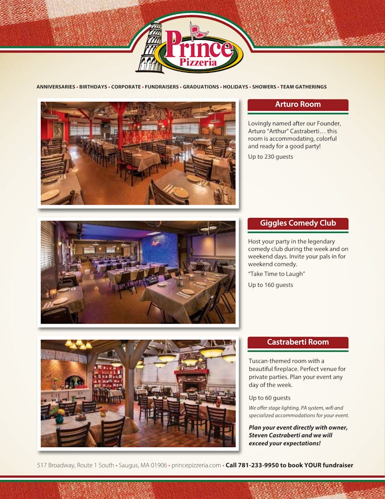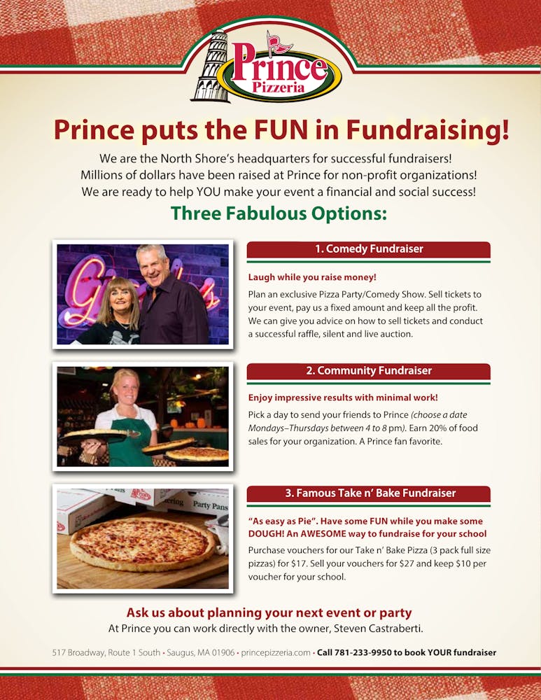 2. Community Fundraiser: Enjoy impressive results with minimal work! Pick a day to send your friends to Prince (choose a date Mondays–Thursdays between 4 pm–10 pm). Earn 20% of food sales for your organization. A Prince fan favorite.