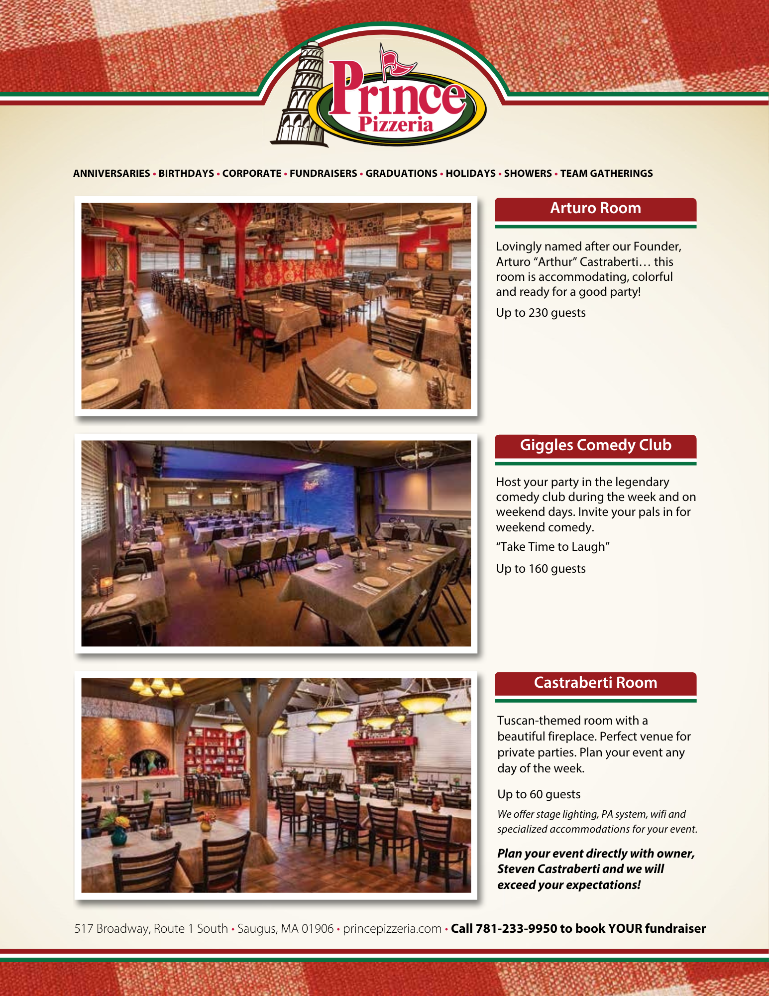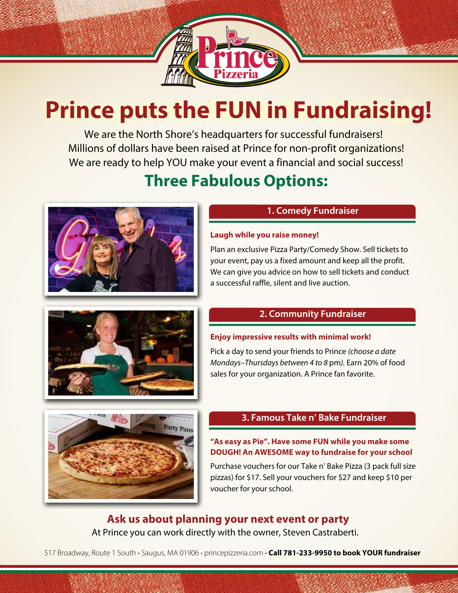 2. Community Fundraiser: Enjoy impressive results with minimal work! Pick a day to send your friends to Prince (choose a date Mondays–Thursdays between 4 pm–10 pm). Earn 20% of food sales for your organization. A Prince fan favorite.
